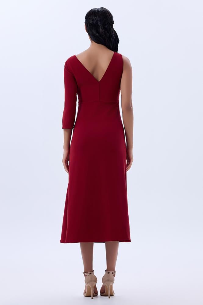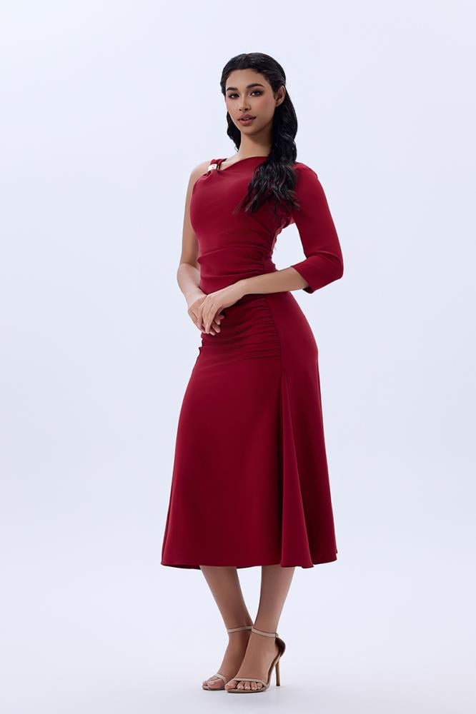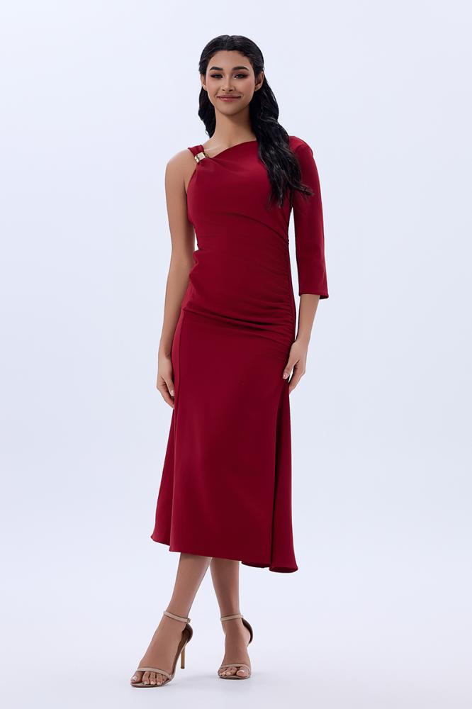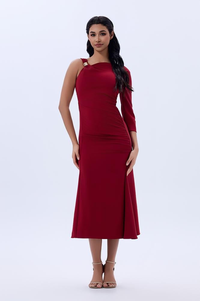 فستان كريب عنابي بثنيات جانبية وكتف روماني بكمّ طويل مع اكسسوار ذهبي لافت على الكتف