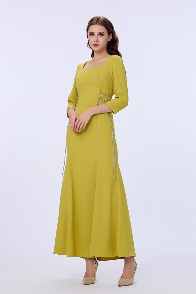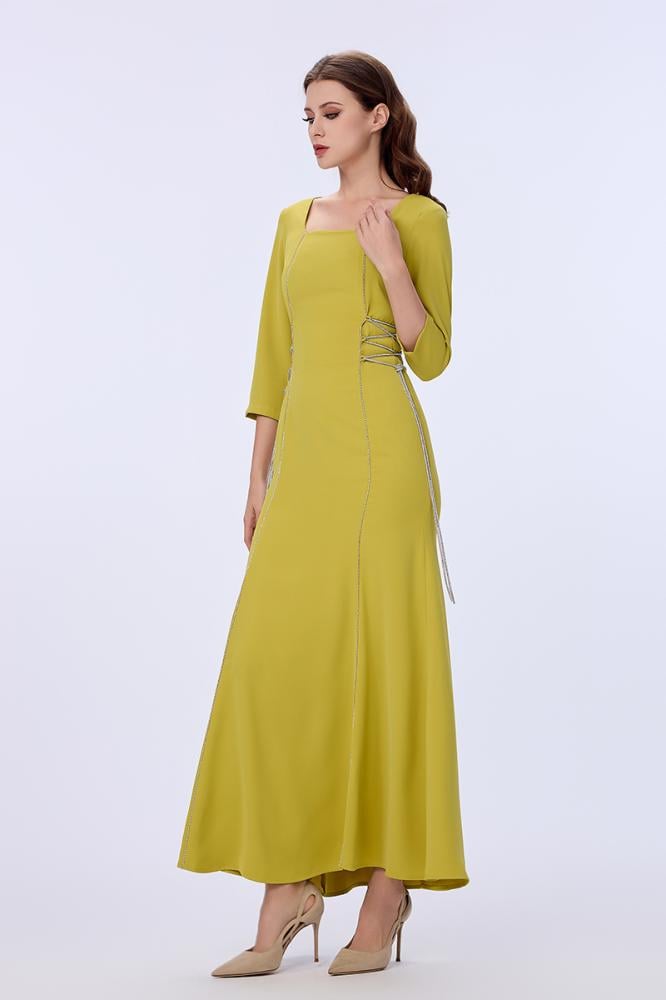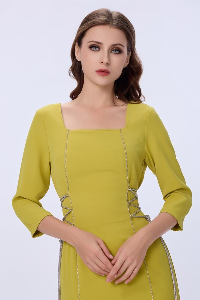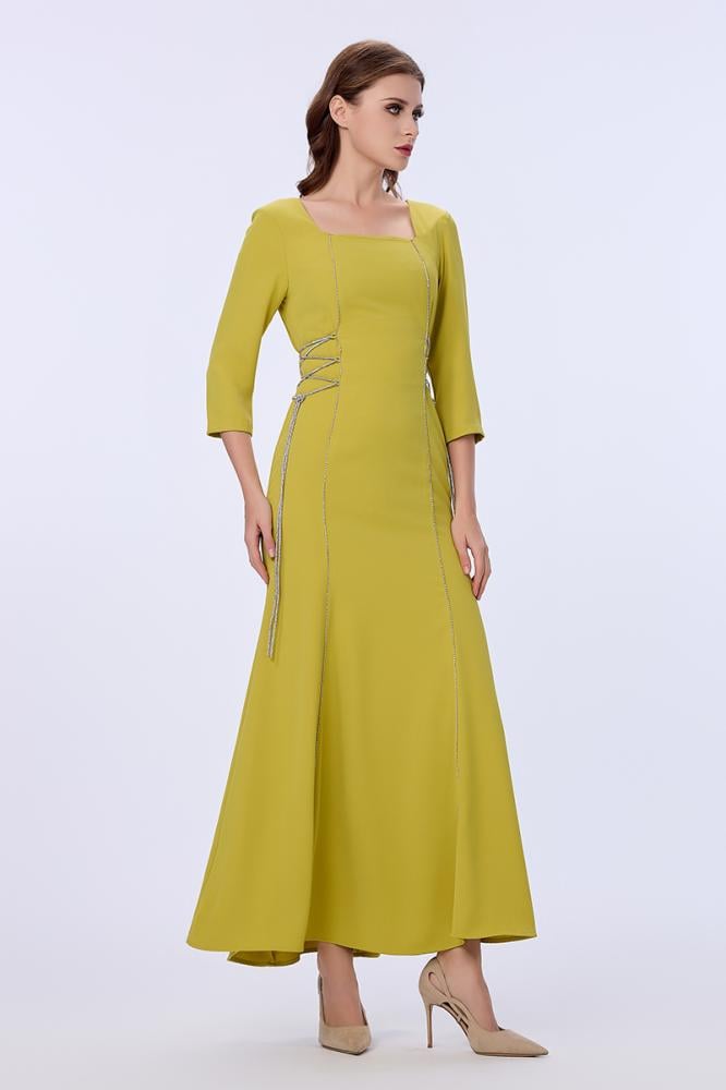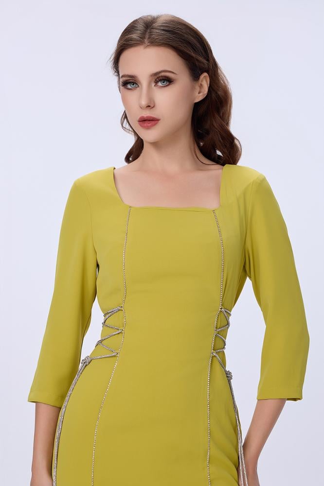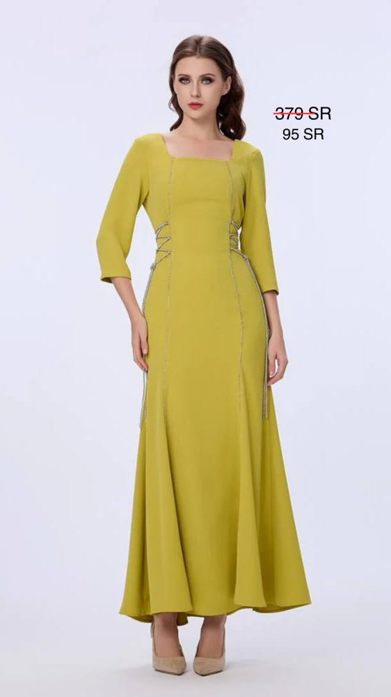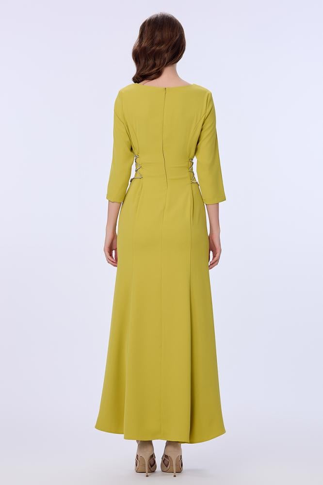 فستان كريب كيوي برباط كريستال على جانبي الخصر لتحديده بشكل انثوي مع قصات بارزة محددة باكسسوار الكريستال