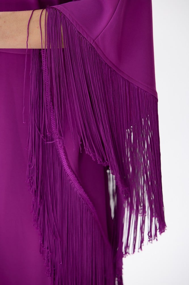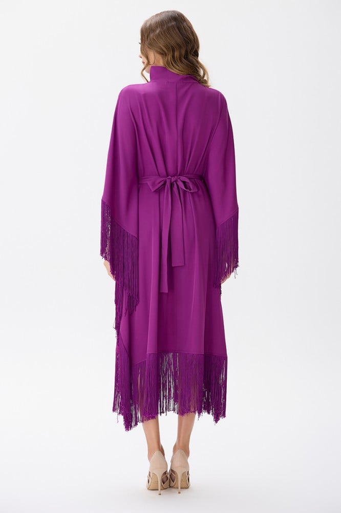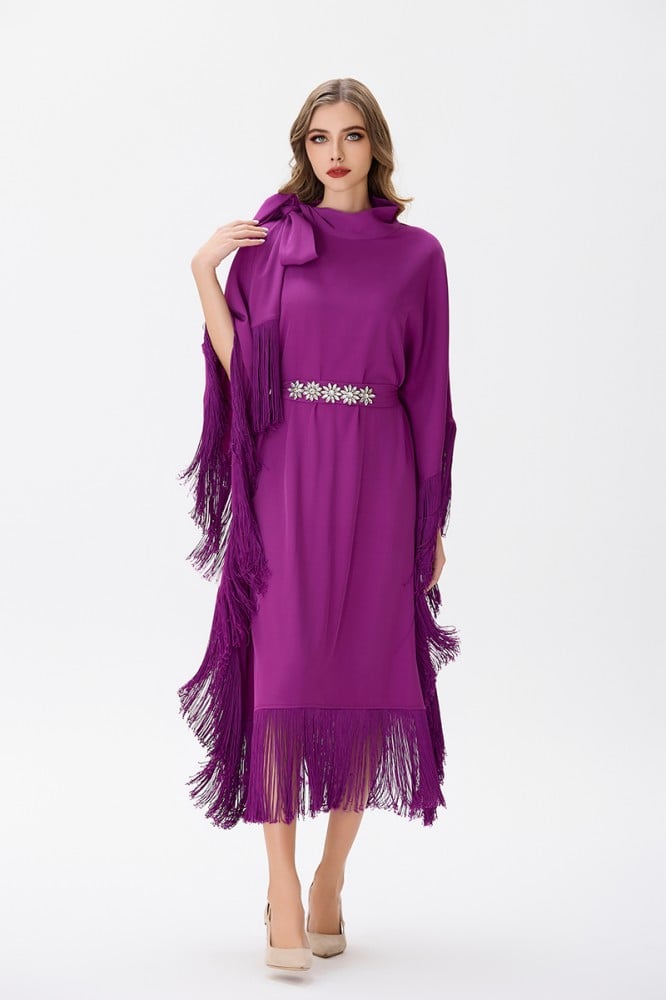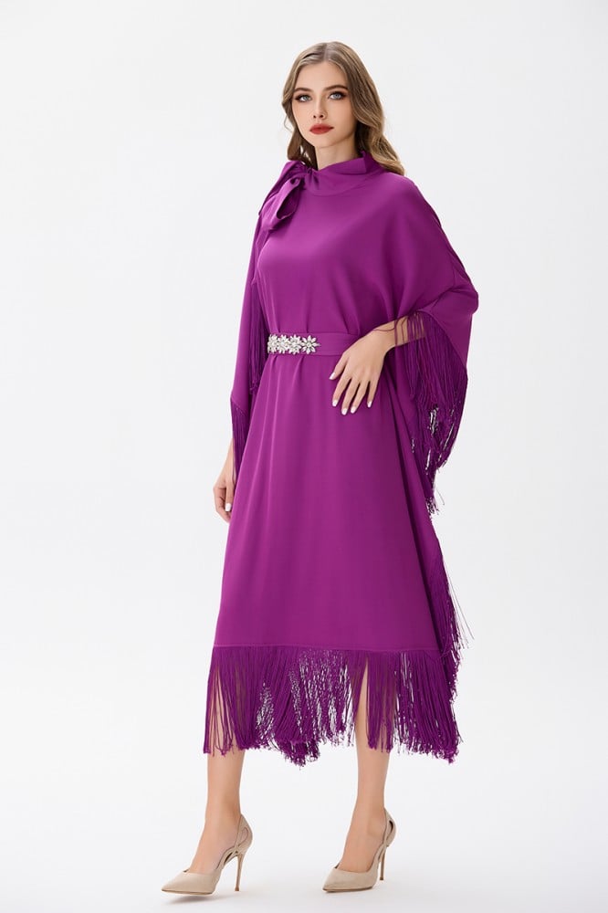 إن هذا الفستان الكريب باللون الموف مع التفاصيل المتدلية والفلونكة والحزام يمثل خيارًا رائعًا للسيدات اللواتي يبحثن عن إطلالة فاخرة ومميزة في المناسبات الخاصة.