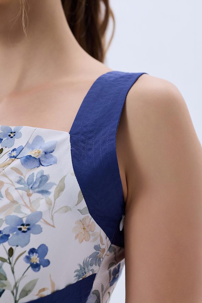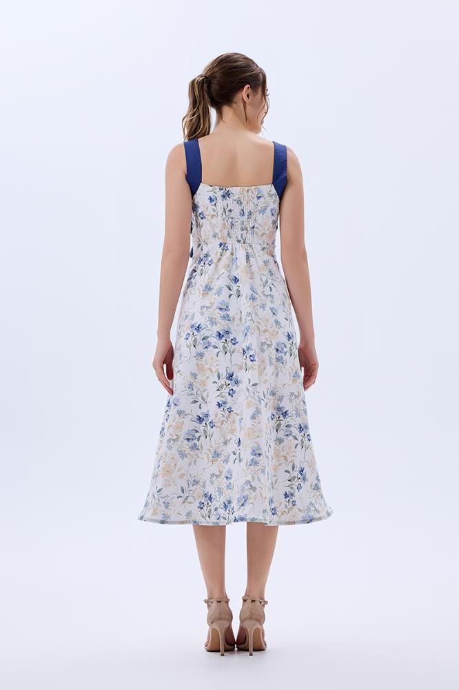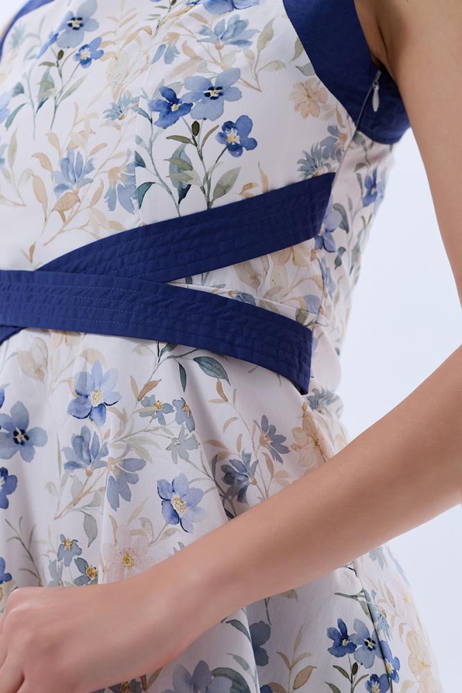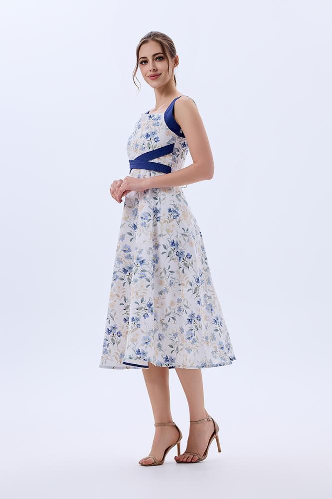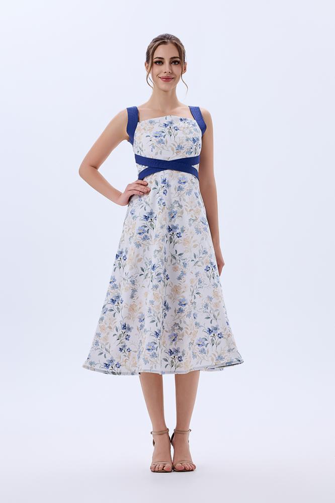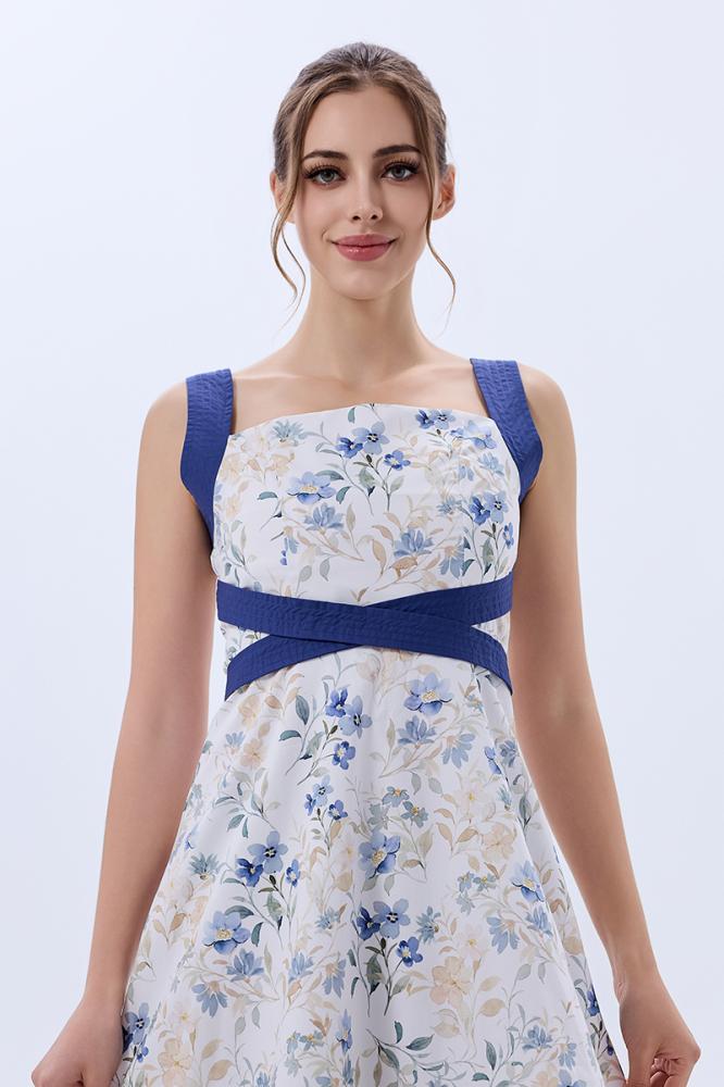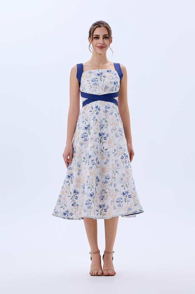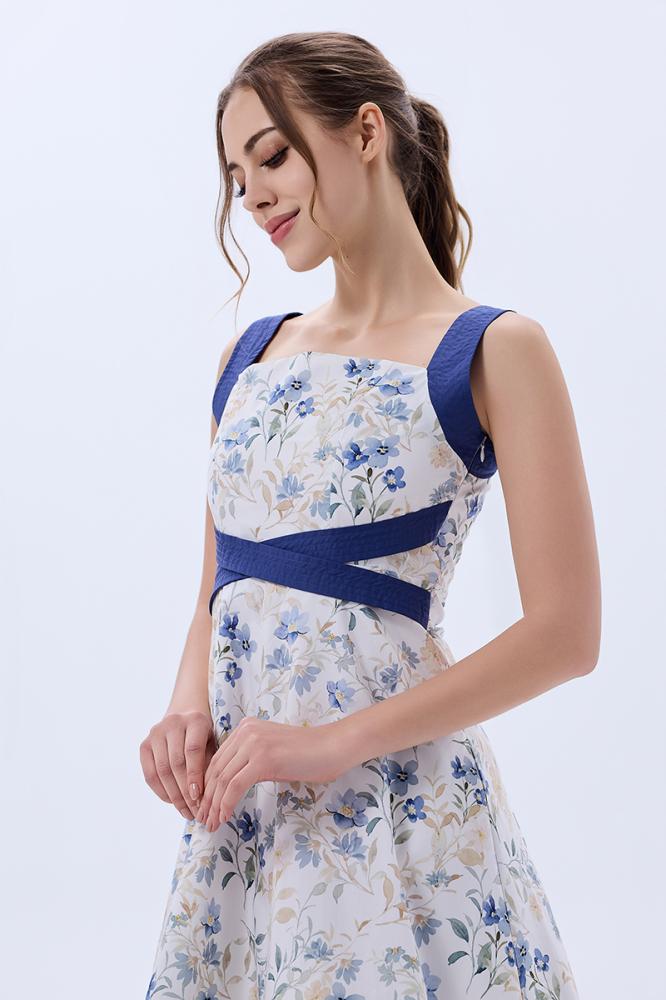 فستان كريب ناعم اوف وايت بنقشة الزهور الزرقاء مع رباط متداخل على الصدر لتصميم عصري مميز مع قصة كلوش