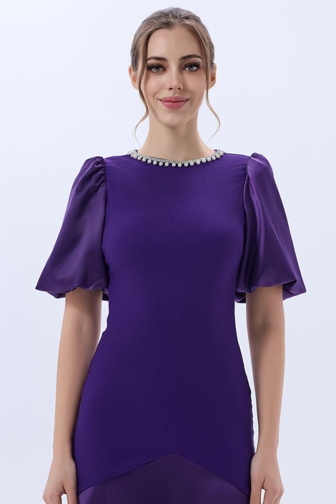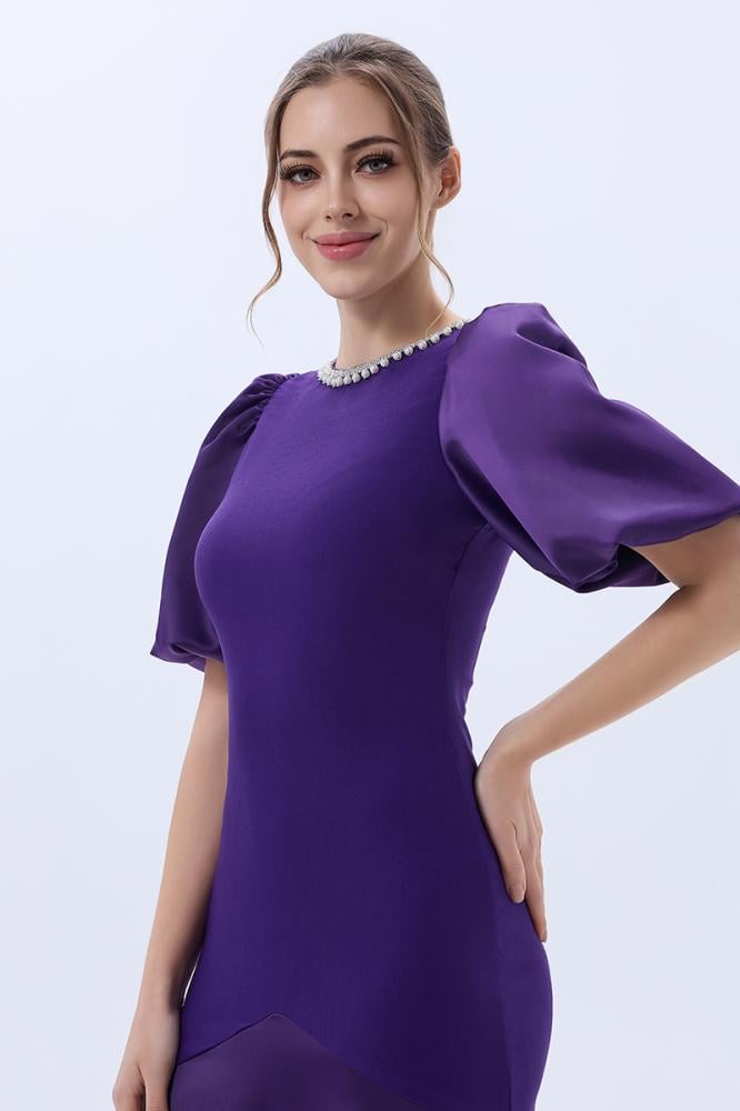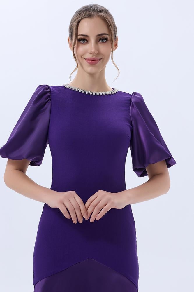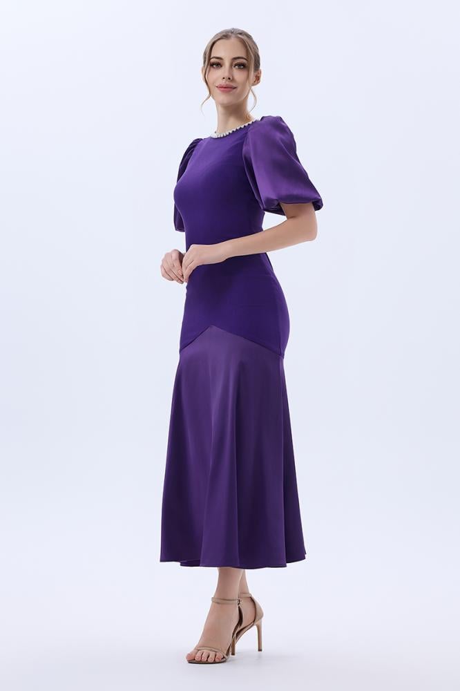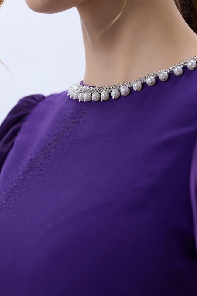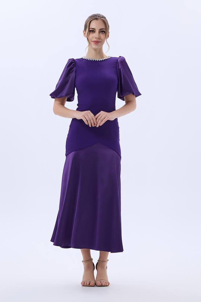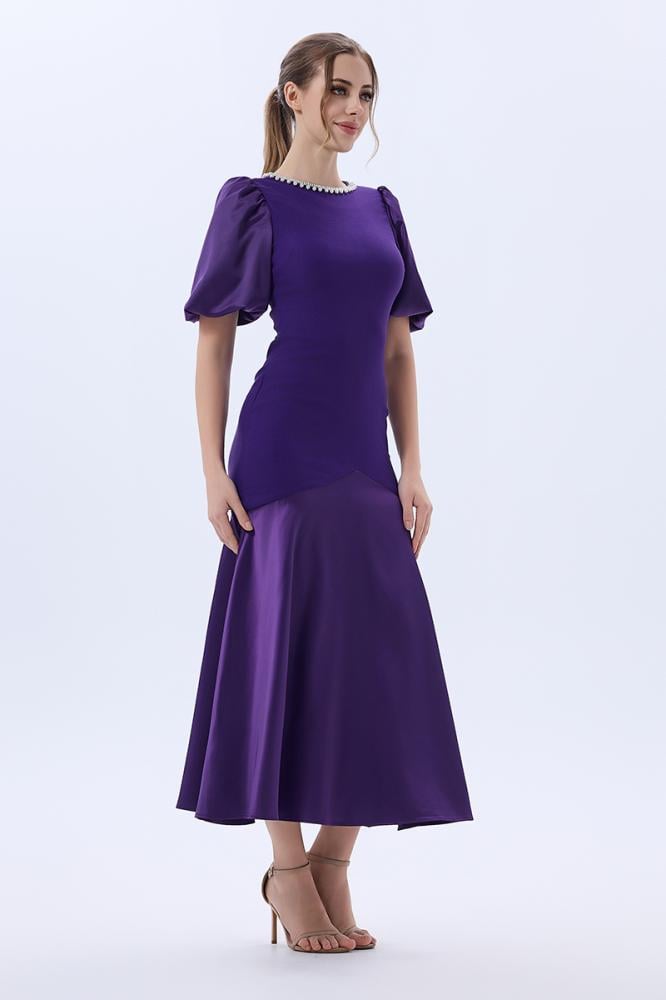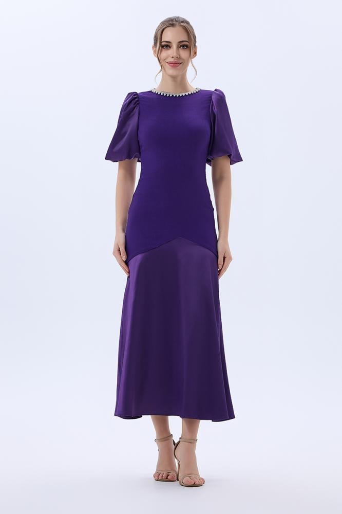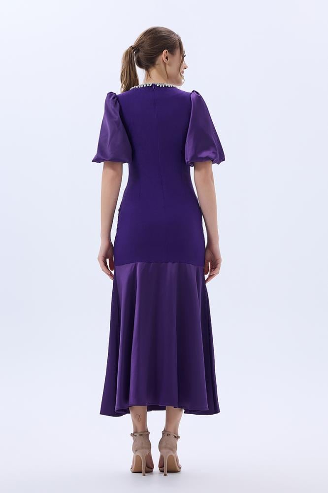 فستان كريب وستان بنفسجي بقصة ماسكة وتنورة كلوش مع اكسسوار على الياقة واكمام فضفاضة قصيرة
