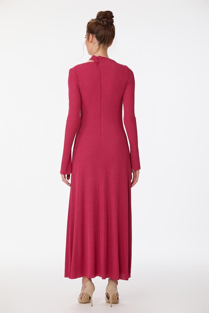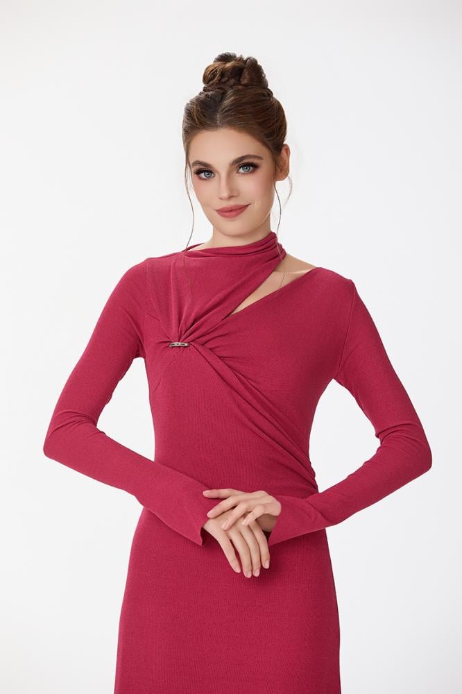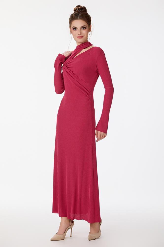 فستان استريتش ناعم لون فوشي بثنيات متداخلة على الصدر مع اكسسوار