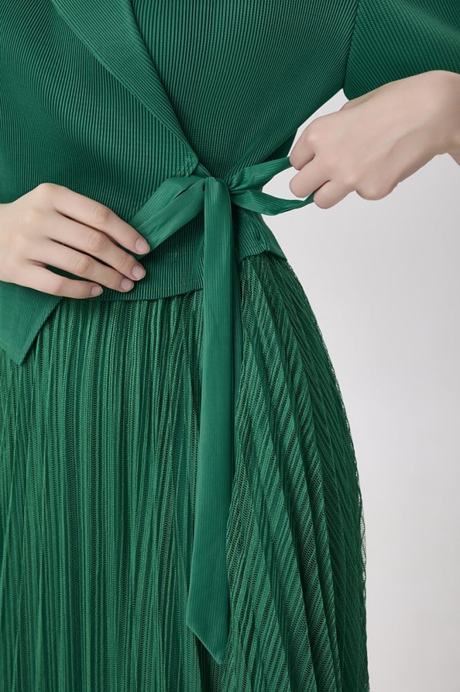 فستان بليسية ليكرا مزدوج الصدر مع رباط جانبي على الخصر تنورة بليسية دانتيل طول تحت الركبة
