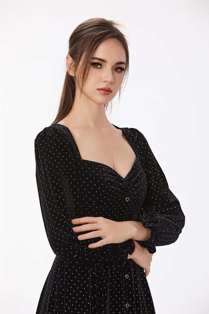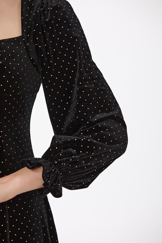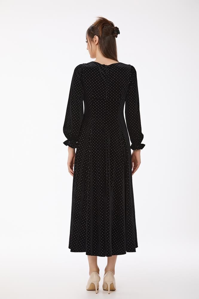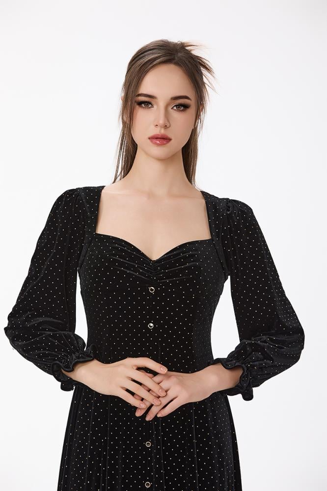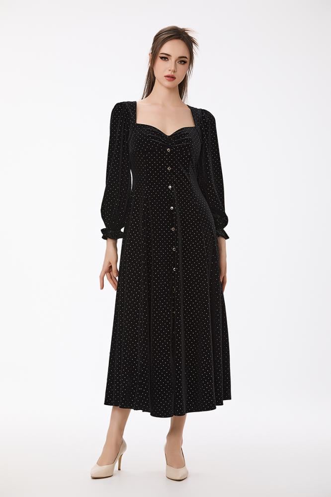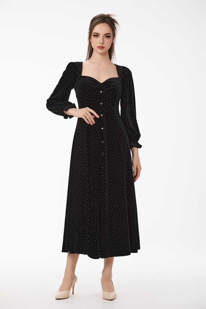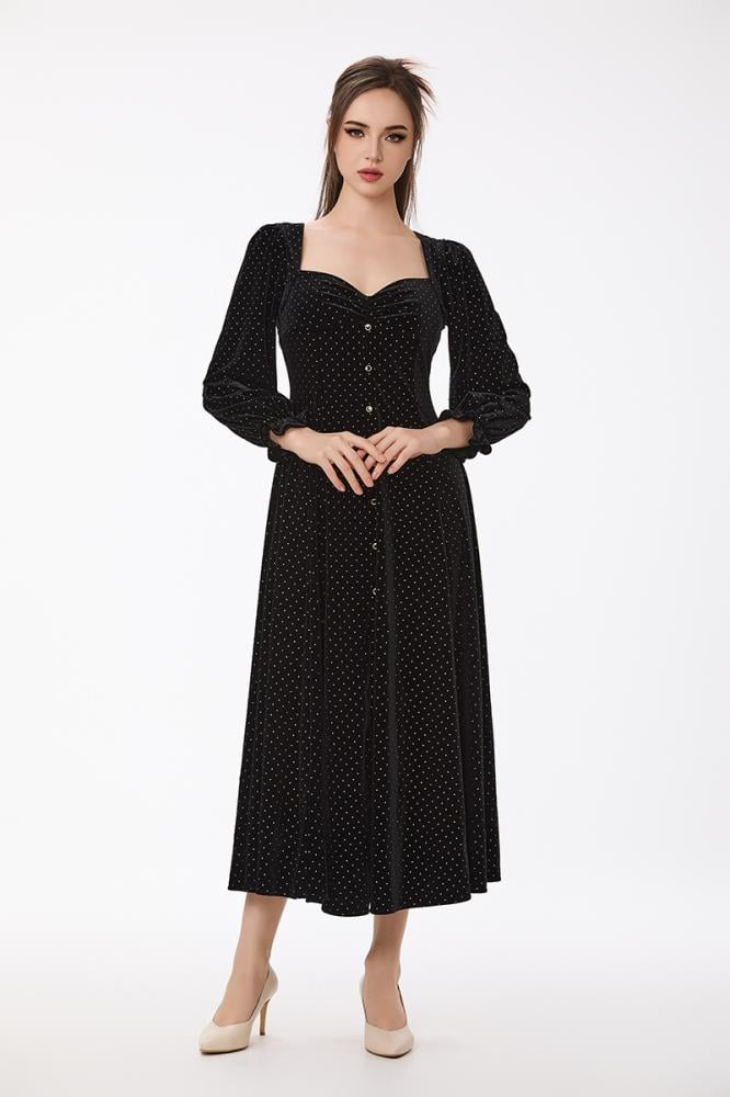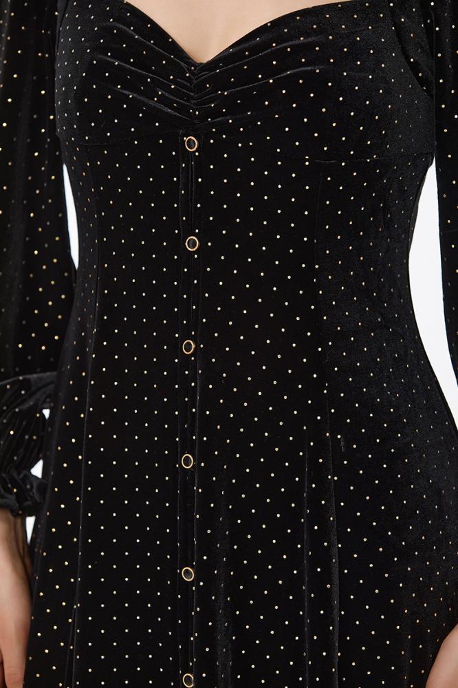 فستان مخمل أسود بتطريز ذهبي وازرار ذهبية بطول الفستان
