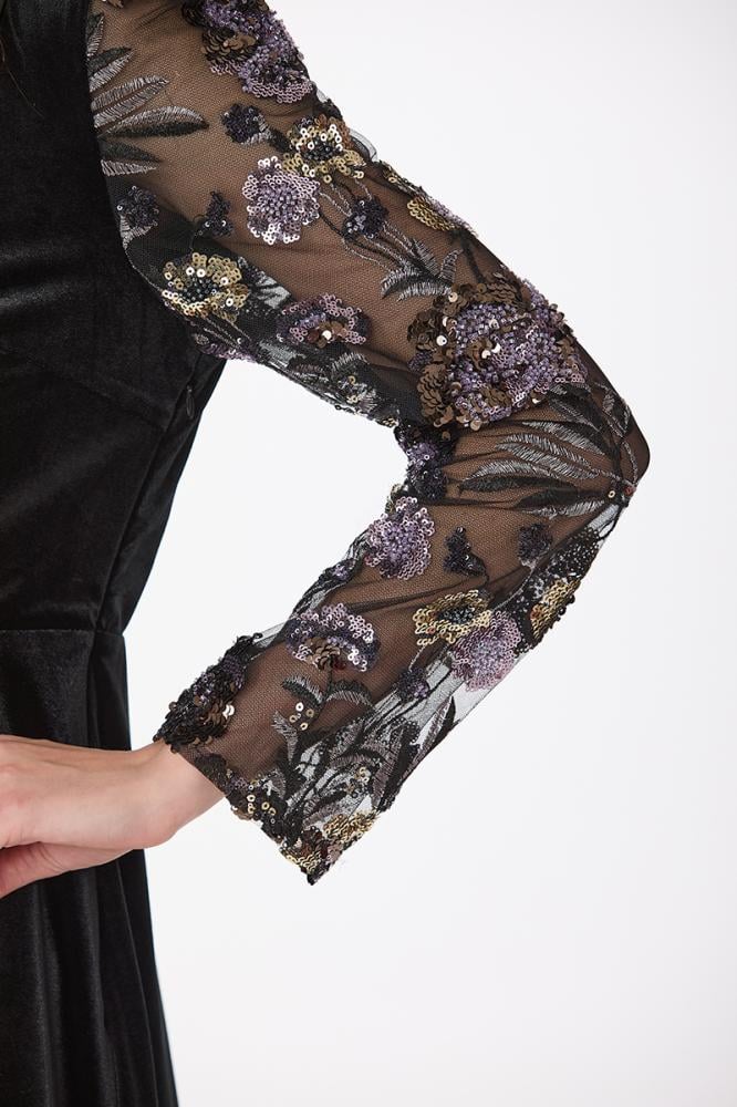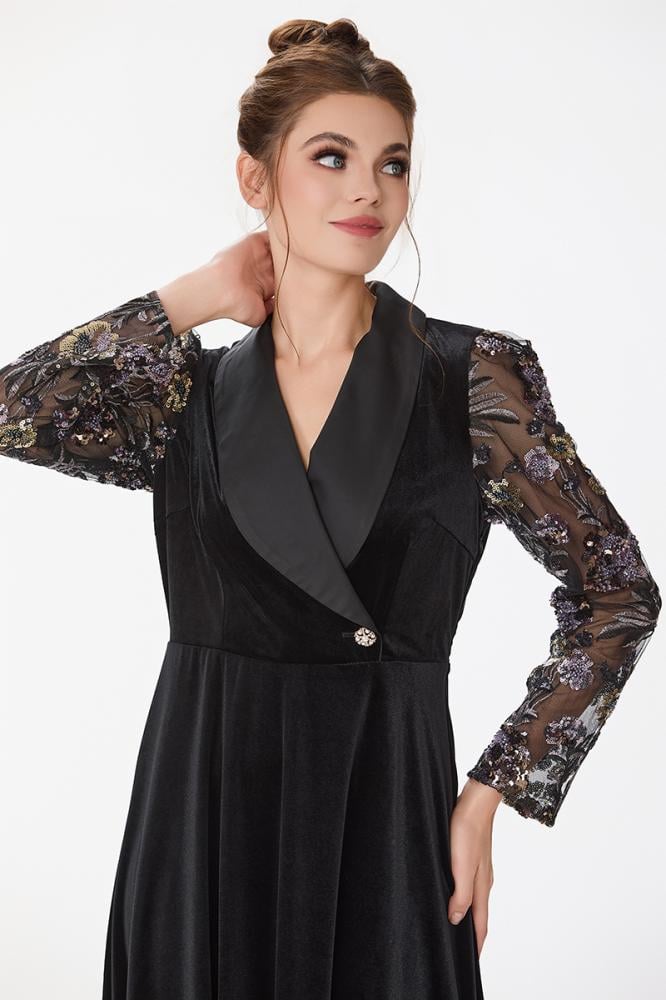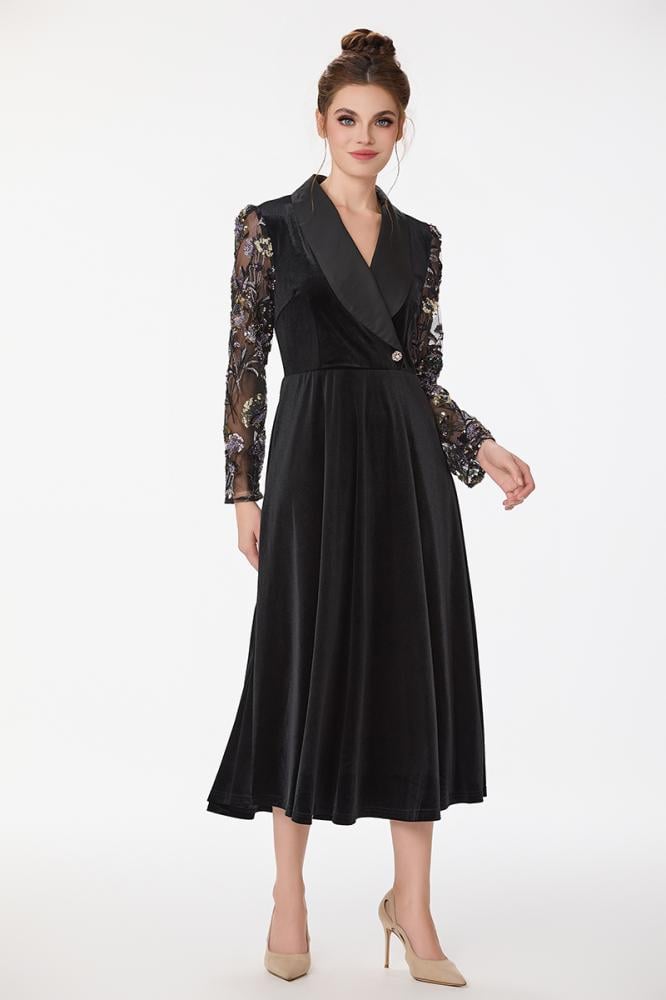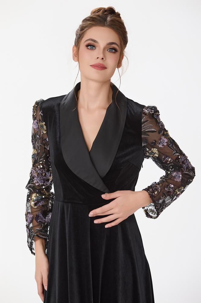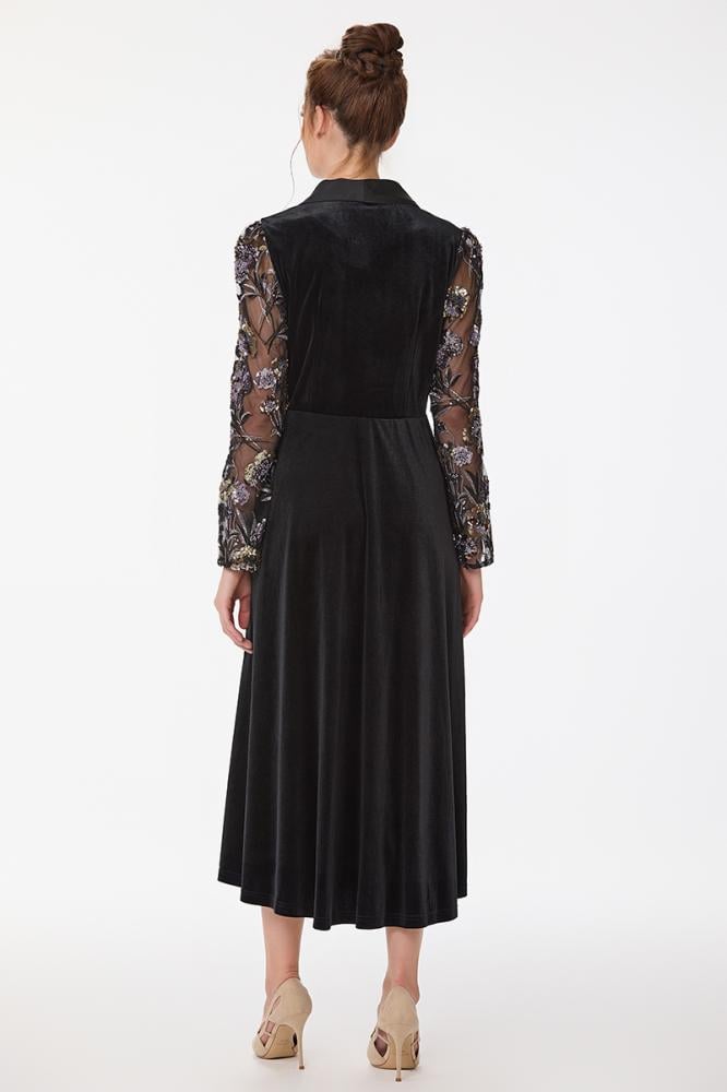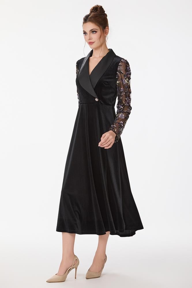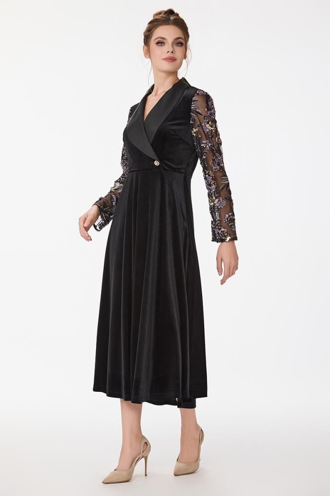 فستان مخمل بقصة مزدوجة وياقة ساتين مع اكمام بتطريز ترتر وتنورة كلوش