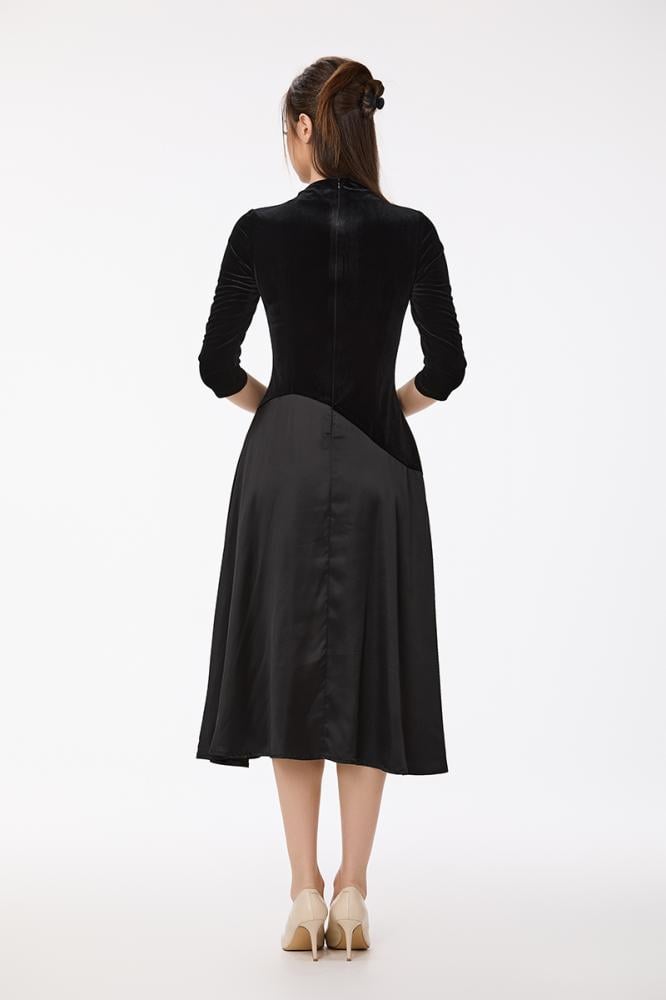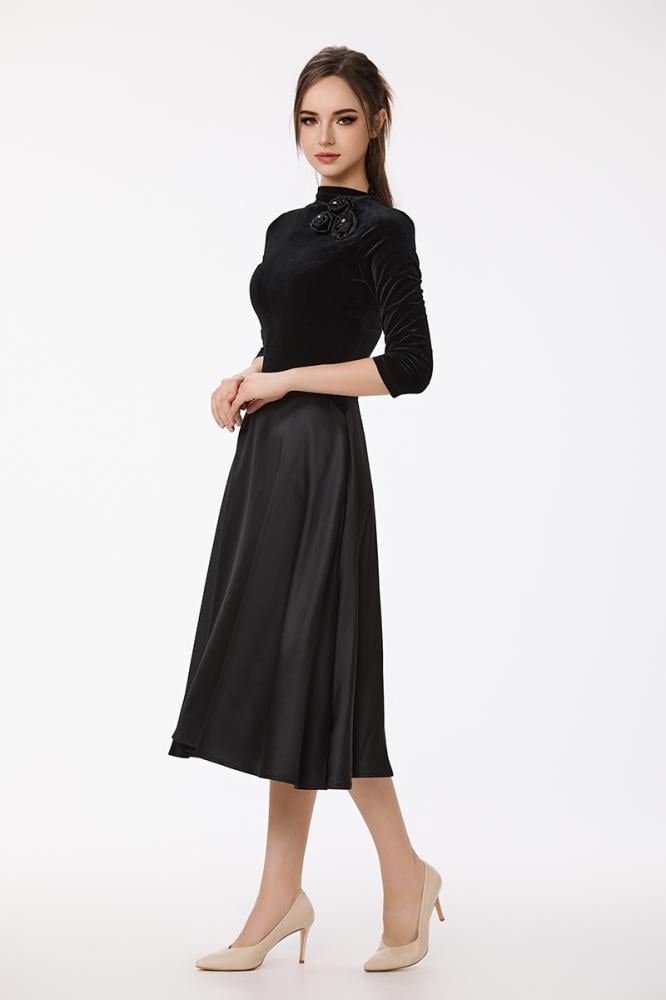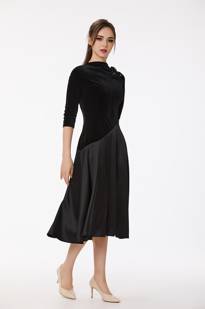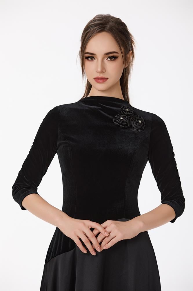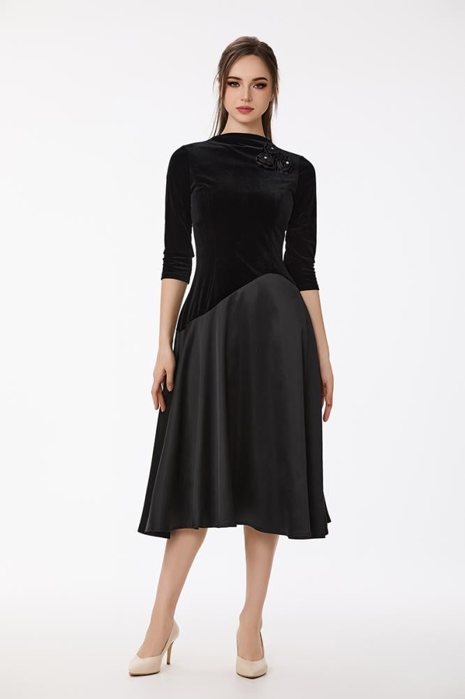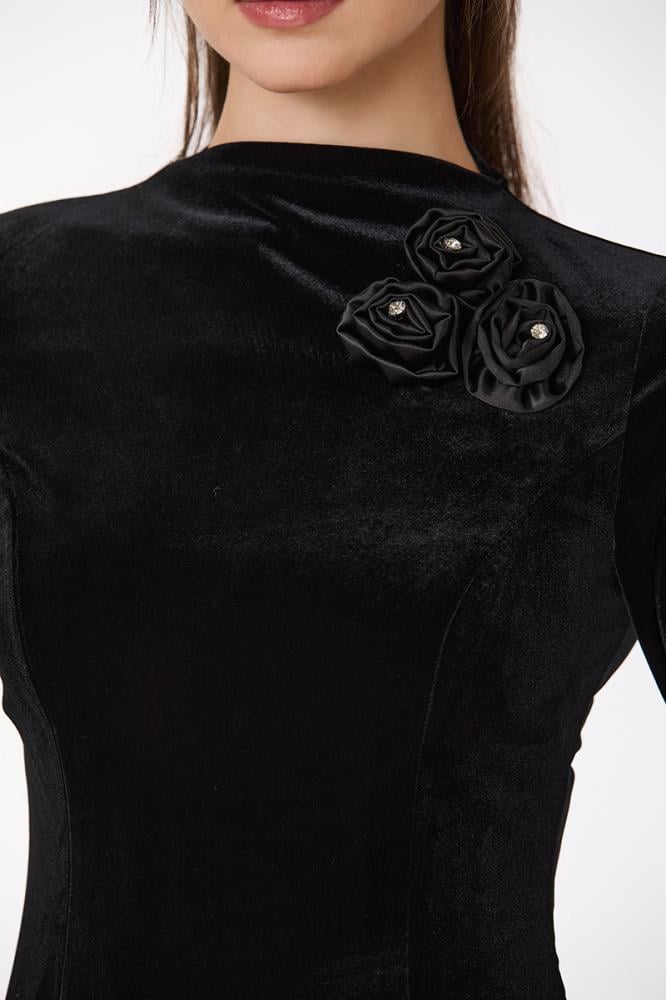 فستان اسود مخمل كريب بقصة مميزة مع اكسسوار على الكتف وتنورة كلوش