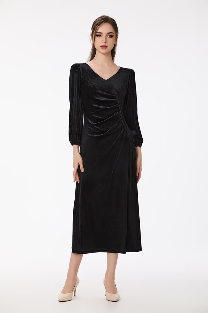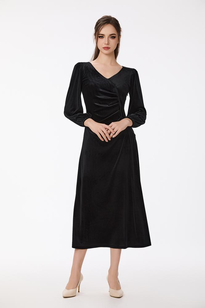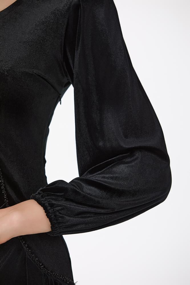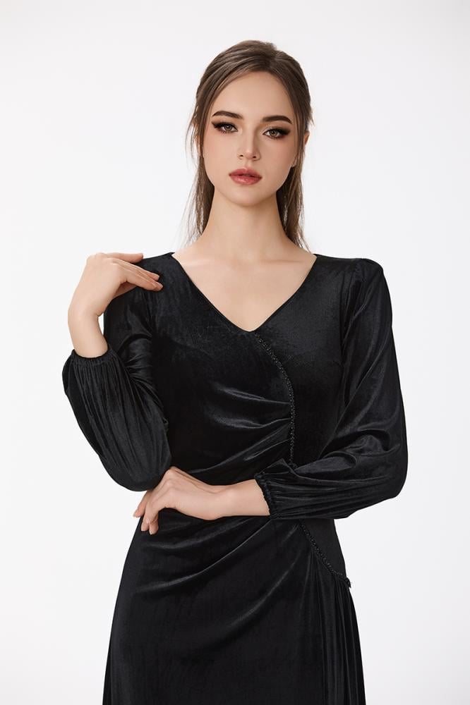 فستان مخمل اسود مع اكسسوار داخل الخياطة مع ثنيات غنية وقصة مريحة باكمام طويلة فضفاضة