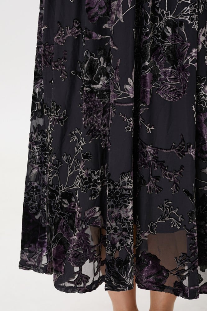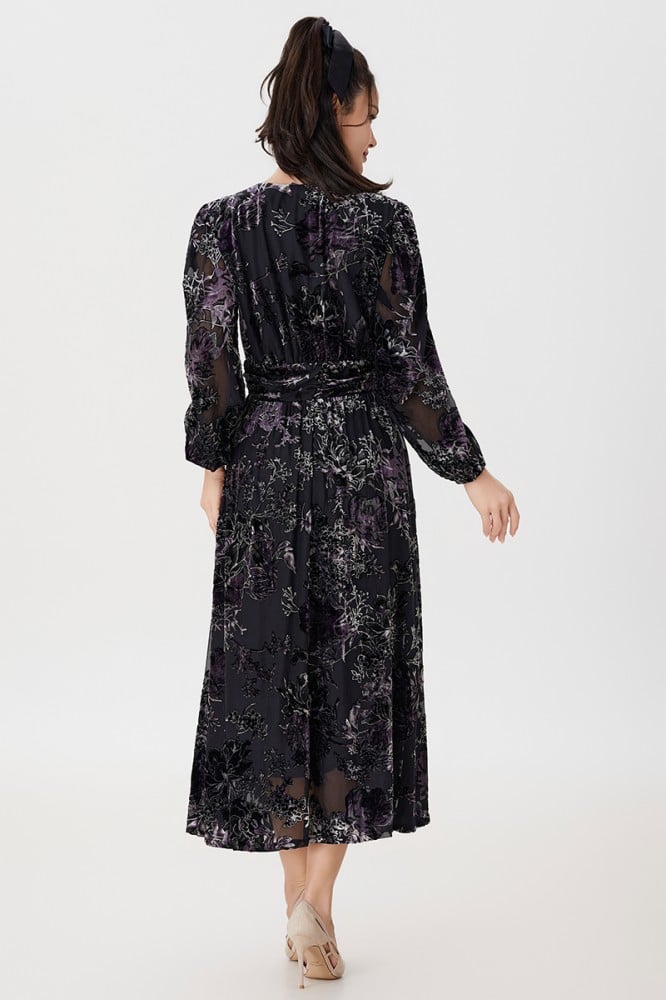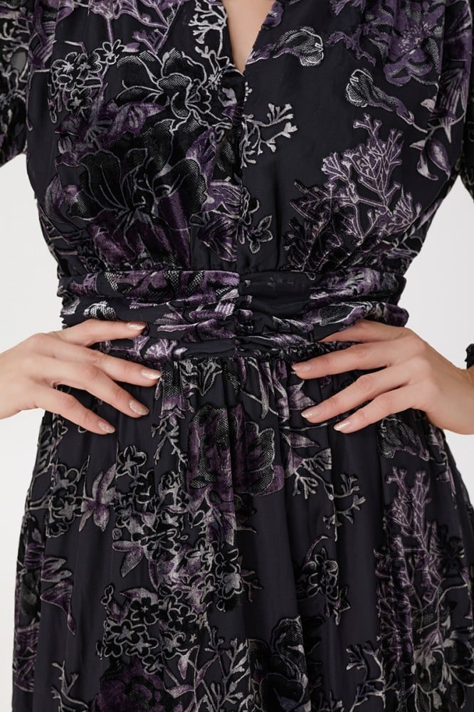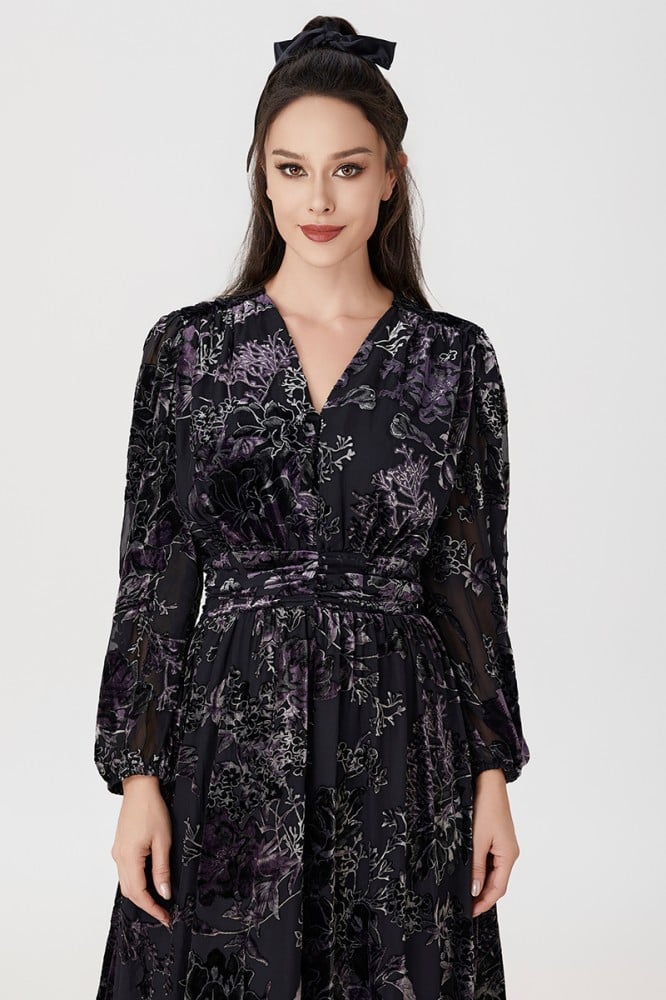 فستان مخمل بنقشة الورد بألوان البنفسجي والأسود ياقة سبعة بأكمام طويلة فضفاضة قصة خصر عريضة بثنيات ناعمة