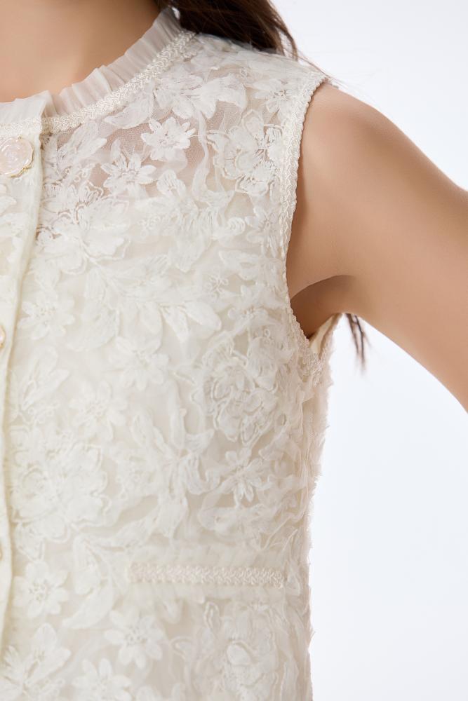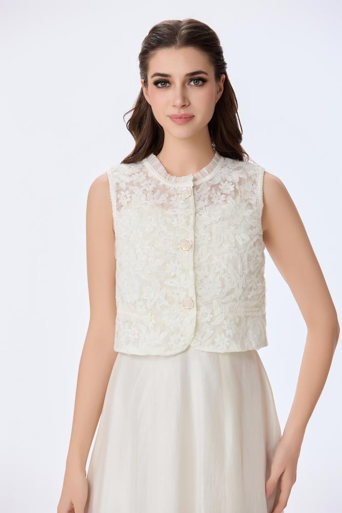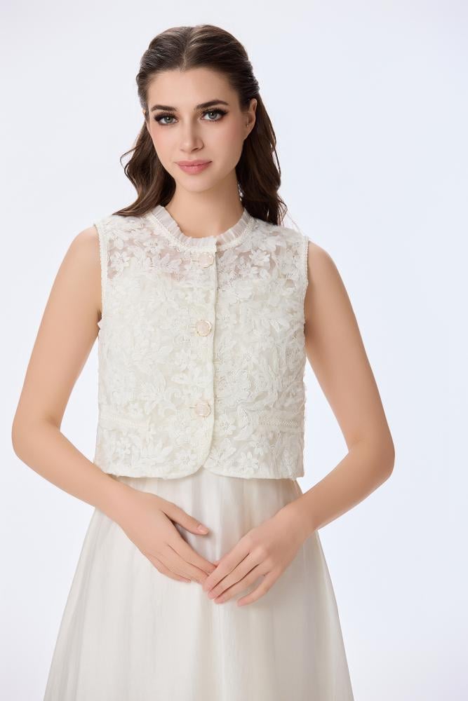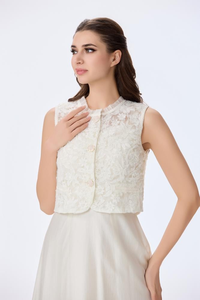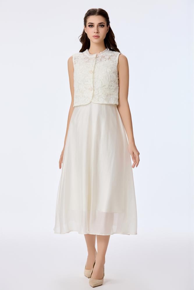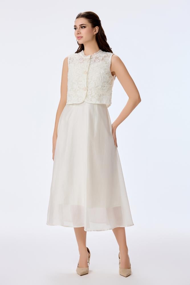 فستان بيج من قطعتين بمزيج من خامات التول المطرز والشيفون الناعم لتصميم انثوي مميز