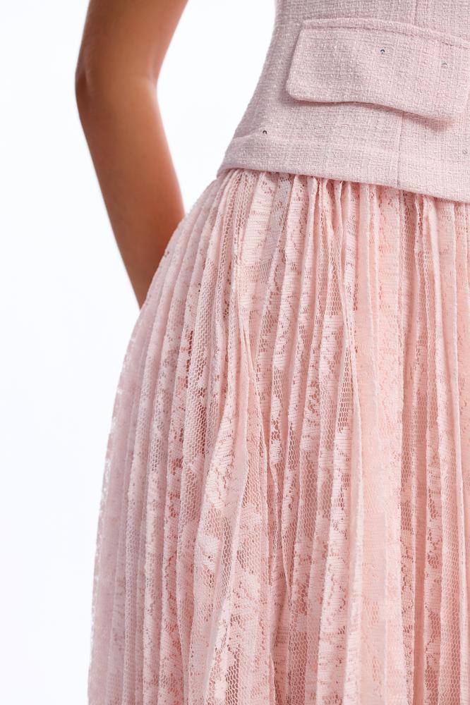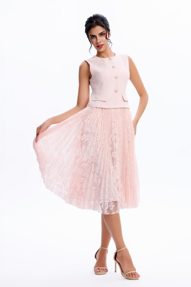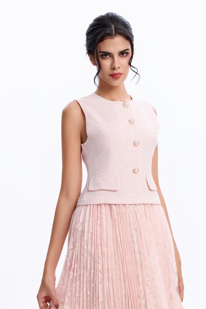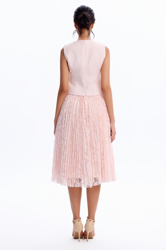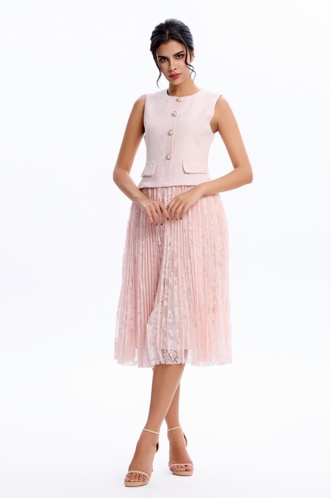فستان وردي بدون أكمام بتنورة دانتيل بكسرات – أناقة ناعمة بطابع كلاسيكي