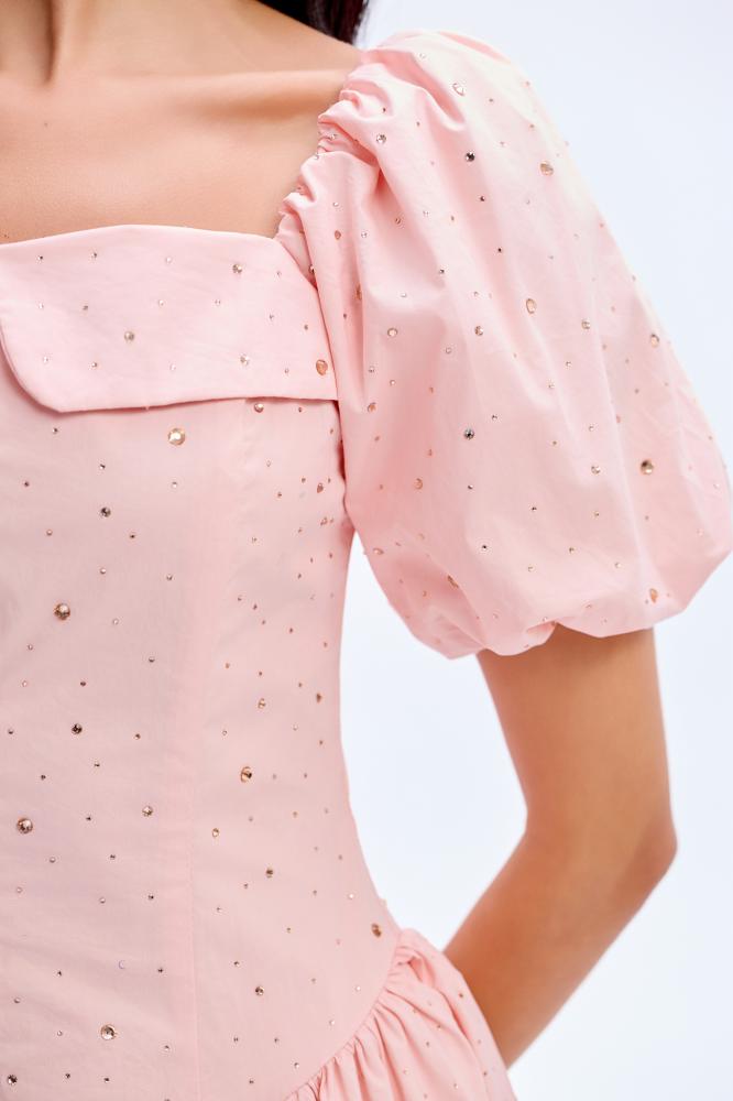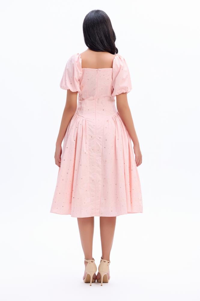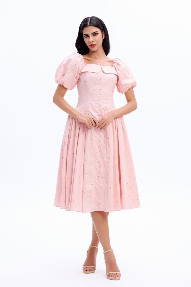 فستان ناعم وملفت بلونه الوردي وتصميمه الأنثوي الأنيق. يتميز بياقة مربعة وأكمام منفوخة تضيف لمسة كلاسيكية عصرية. القماش مزين بالكامل بكريستالات لامعة تضيف إشراقة خفيفة وجاذبية في كل حركة. تنورته الواسعة تمنح حرية وراحة، مما يجعله مناسبًا للعديد من المناسبات.