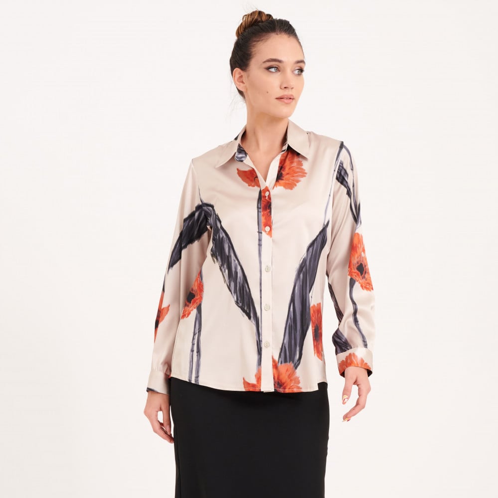 بلوزة ساتين بيج بنقشة عصرية باللون البرتقالي كم طويل