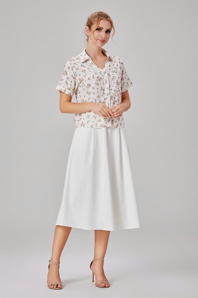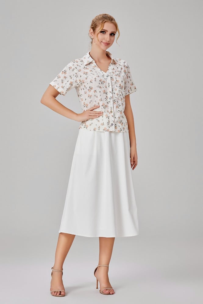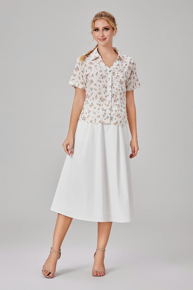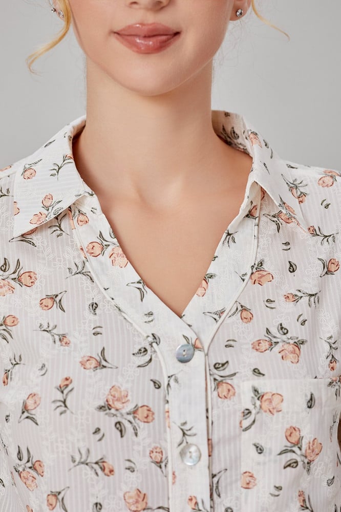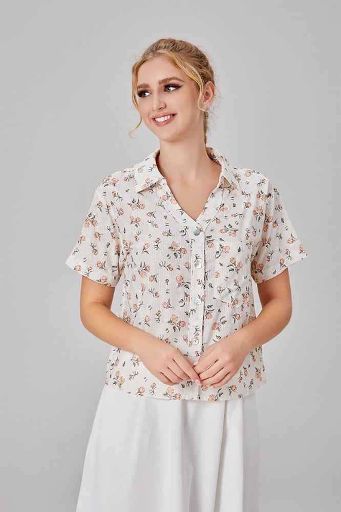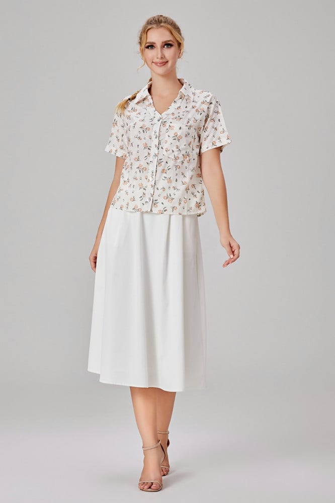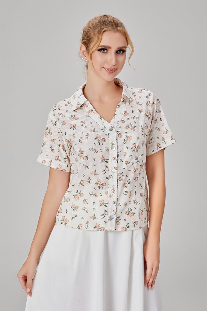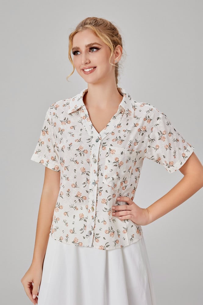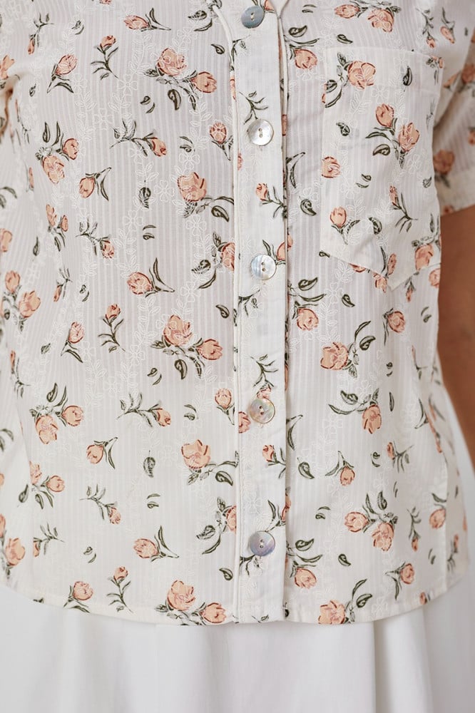 بلوزة قطن ببج بنقشة الزهر ياقة سبعة مع زراير مميزة وجيب جانبي